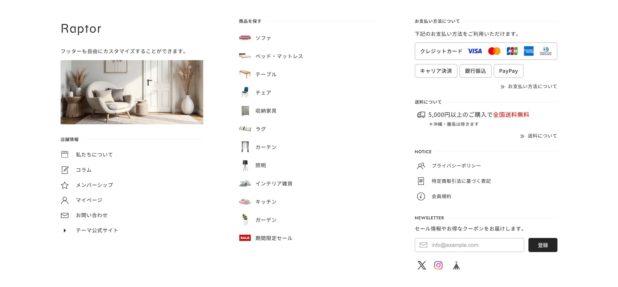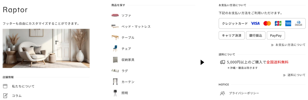フッターにはフリースペース、カテゴリー、ショップ情報、お支払い情報、送料など、