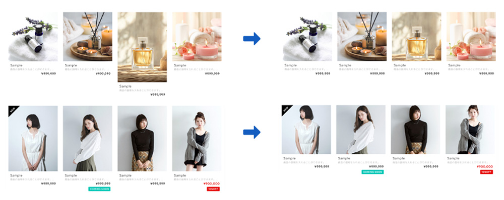 商品の写真サイズがバラバラの場合でも加工する必要なく、統一感のあるレイアウトを実現します。