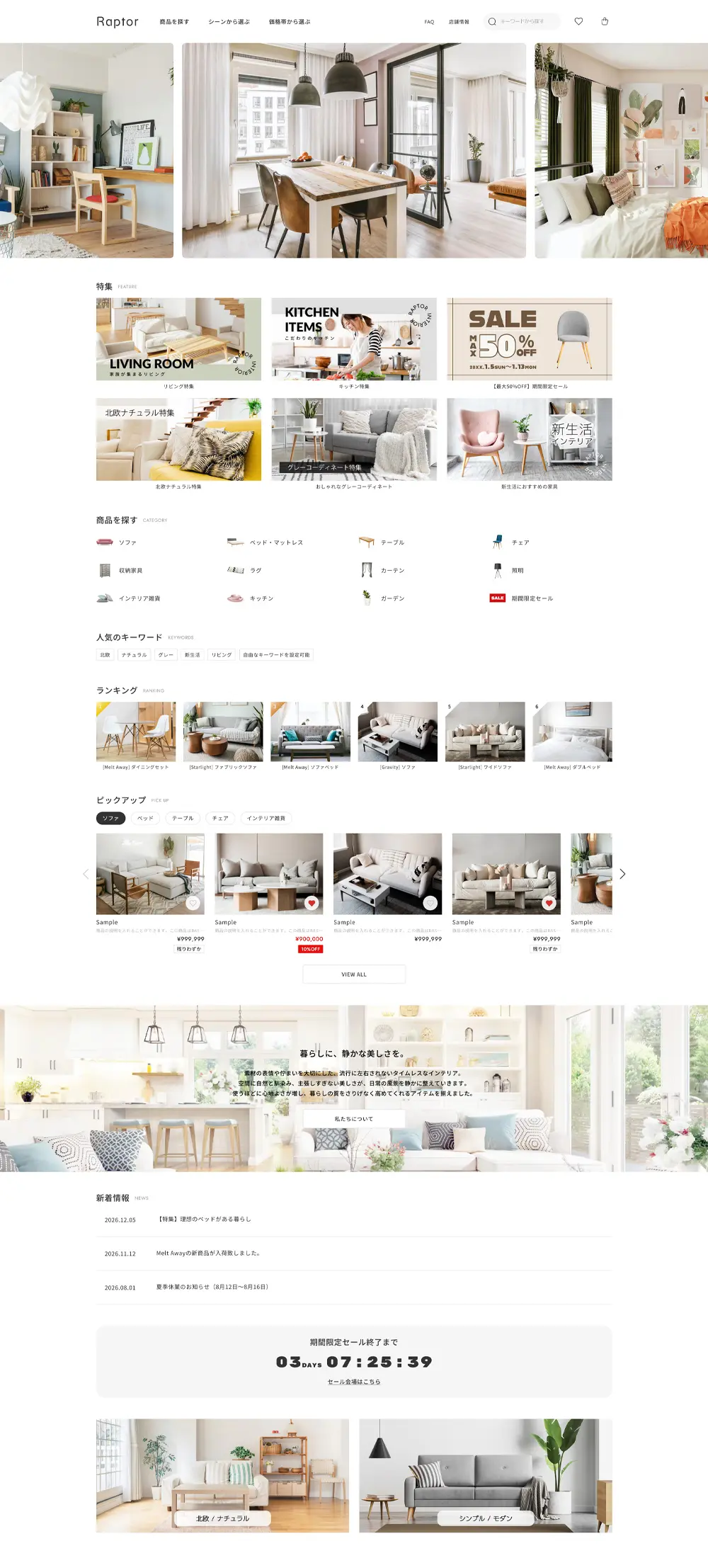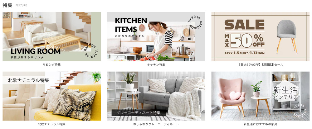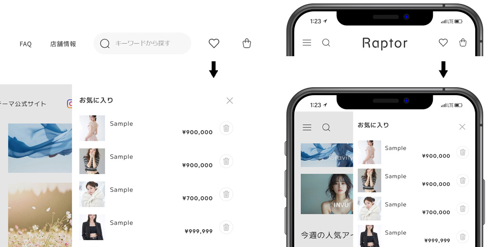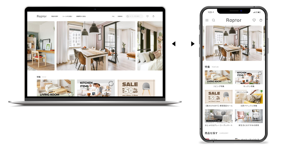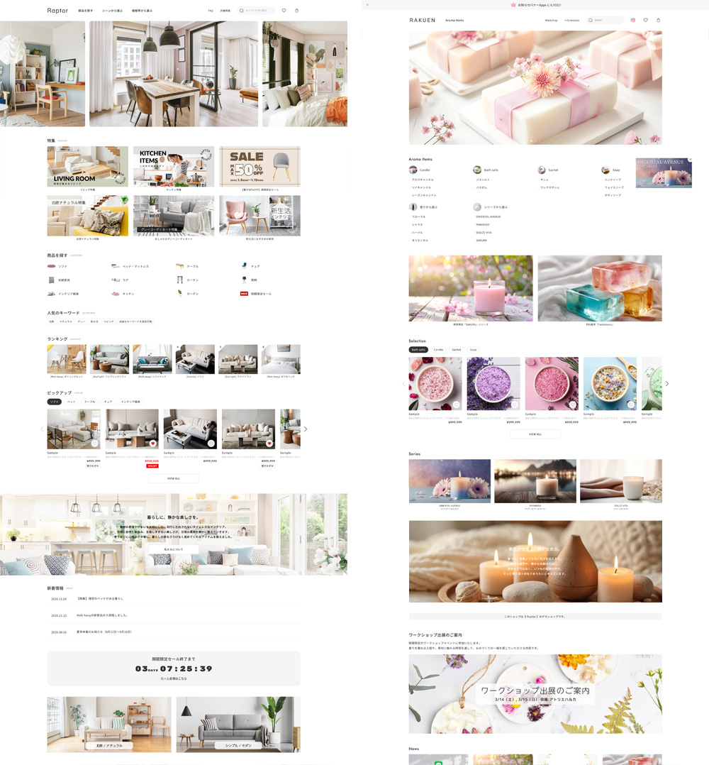 『Raptor』は情報量の多いショップでも見やすさと回遊性を両立し、機能的で美しいレイアウトを実現します。