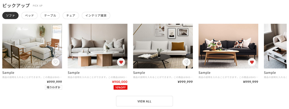 事前に商品の説明文章内に「5,000円以上」というテキストを入れておく必要があります。具体例として、下記デモショップの商品ページでは「#10,000 ~ 19,999円」「#リビング 」というキーワードを商品説明に入れています。