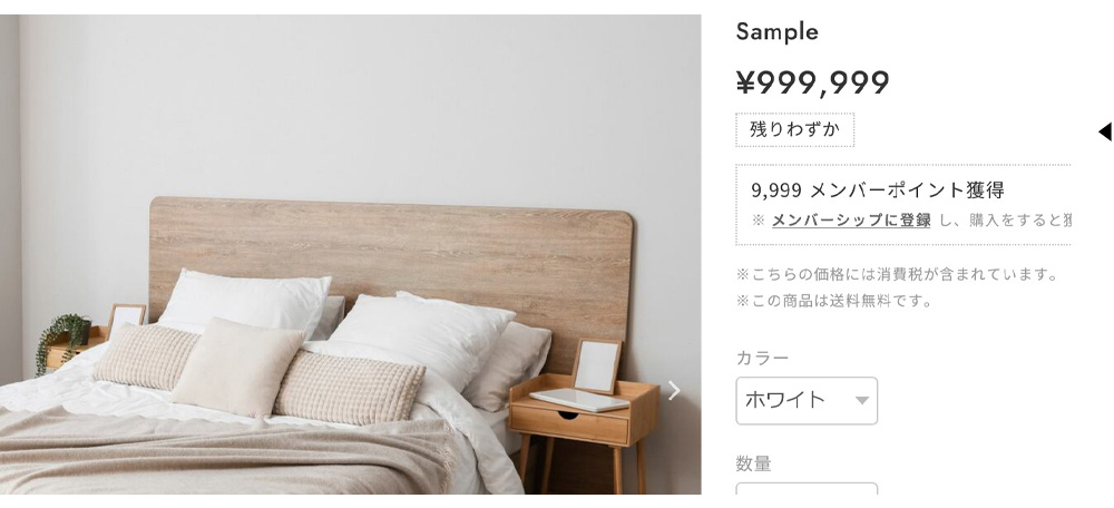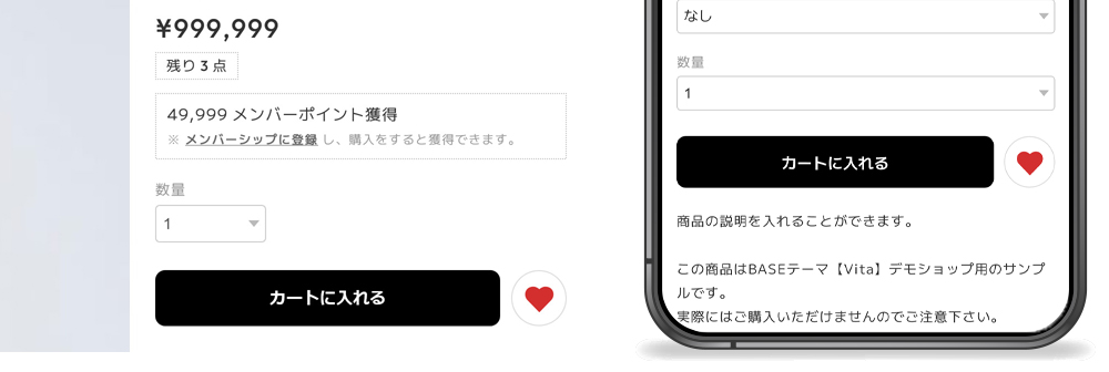購入ボタンのカラーは変更可能で、在庫数を「残りわずか」のように表示したり、