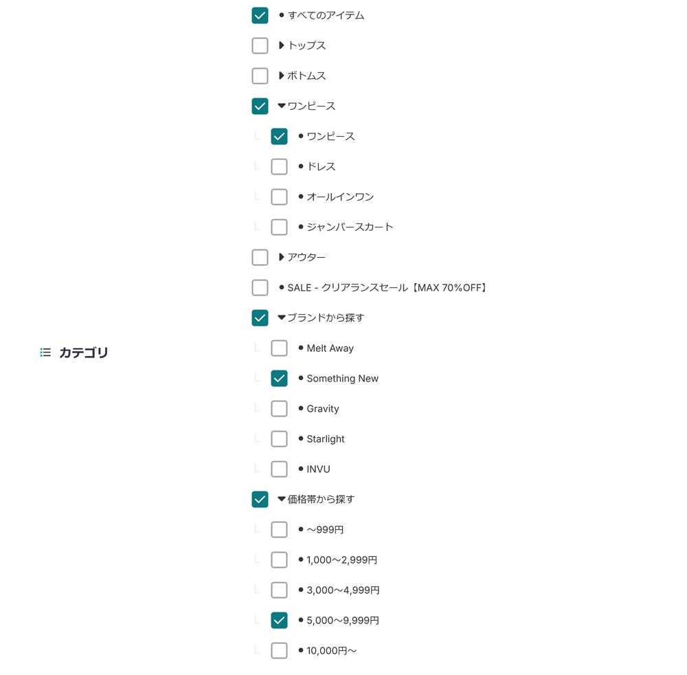 リンク先に商品を表示するためには、設定するテキスト(キーワード)を事前に商品のタイトルや説明文章に入れておく必要があります。例えば『価格帯から選ぶ』というメニューの中に『5,000円以上』という項目を設定した場合にも、