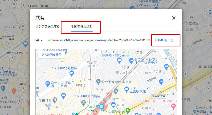 4. 「地図を埋め込む」のタブを選択して「HTMLをコピー」をクリックします。