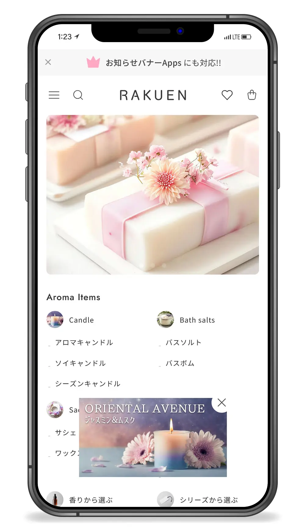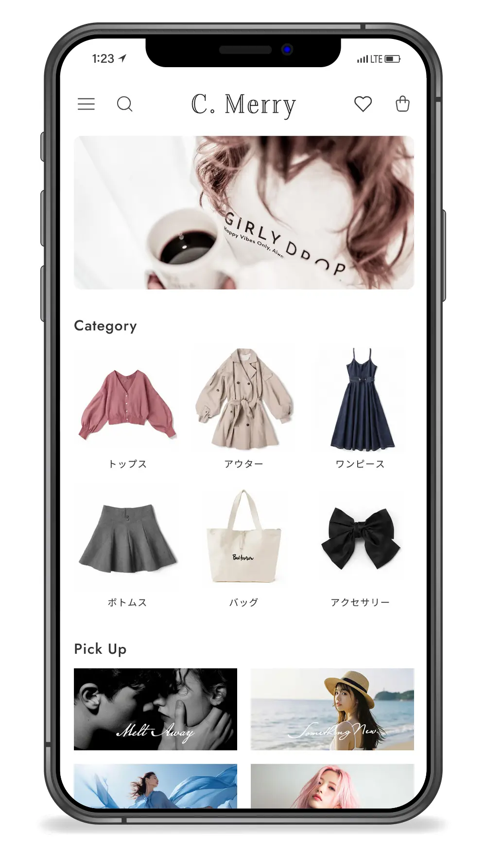 ヘッダー(メニュー/検索/お気に入り/カート)はスクロールしても常に画面上部に表示される機能的なデザインです。