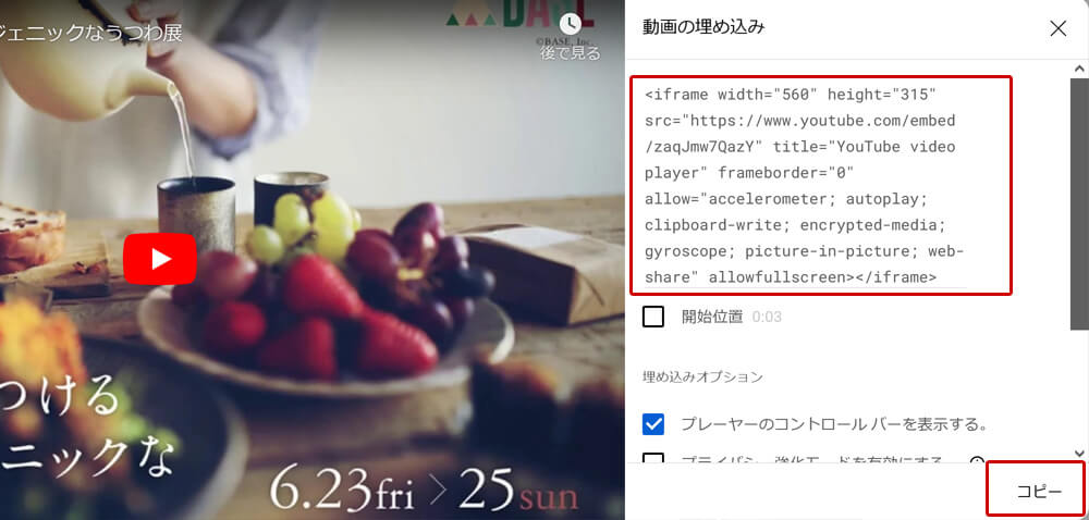 4. 「コピー」をクリックして埋め込みコードをコピーします。