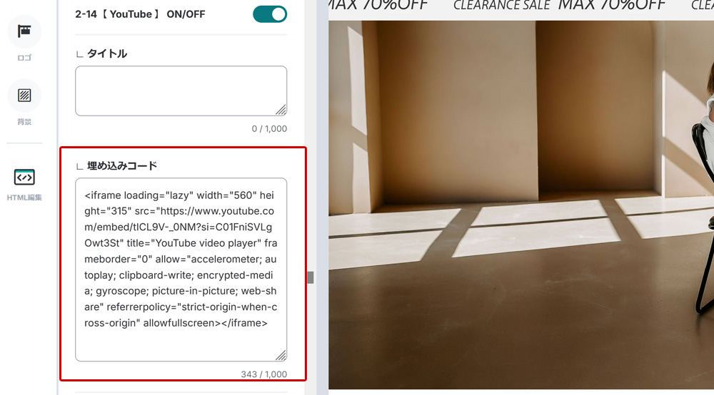 5. BASEのデザイン画面の「YouTube動画 埋め込みコード」のテキストエリアにペーストします。