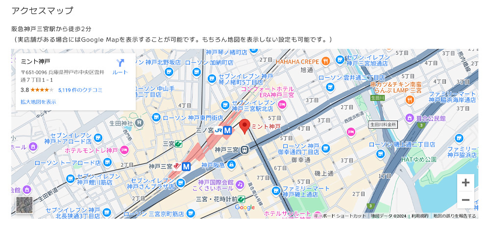 「 <br> 」と入力すると改行され、「 <p> ~ </p> 」で囲むと段落になり、「 <b> ~ </b> 」で囲むと太字になります。<p> <b>【営業時間】</b> <br> 11:30-15:00(L.O. 14:30) <br> 18:00-23:00(L.O. 22:00) </p> <p> <b>【定休日】</b> <br> 日曜日・祝日 <br> 神戸市中央区山本通1-1 </p>以下のように表示されます。