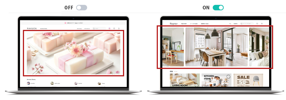 商品一覧の各商品画像の元の縦横比率を維持したい場合にはOFFにしてご利用ください。