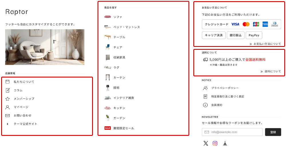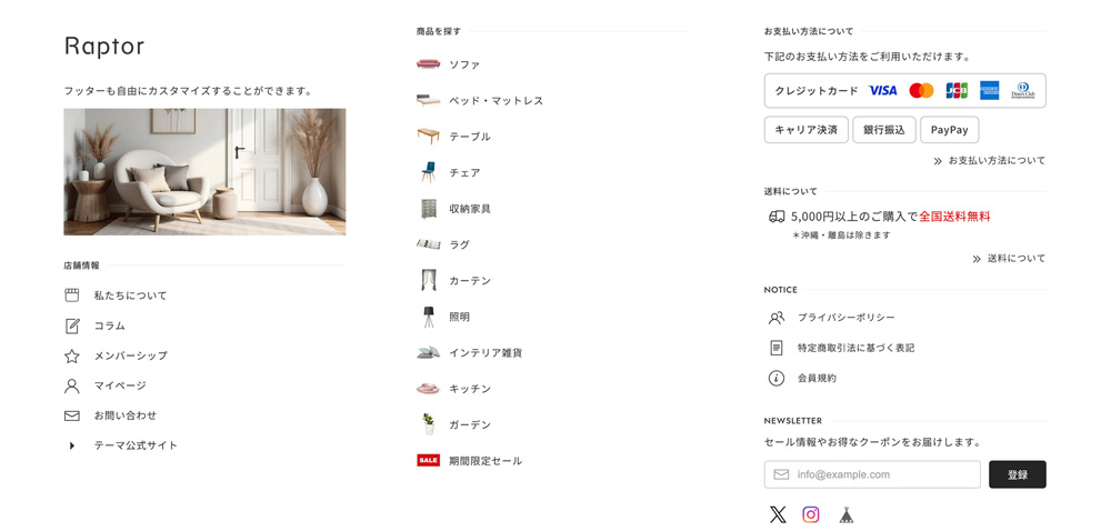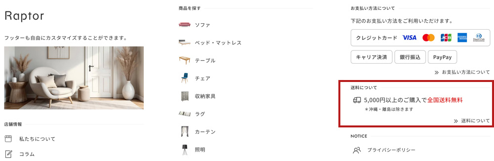 Raptorのテーマ機能を利用して、アバウトページに「FAQ」や「お買い物ガイド」などの自由な内容を2つまで掲載することが可能です。 詳しい設定方法は、オンラインマニュアル「 3-2 アバウトページ フリースペース 」をご覧ください。
