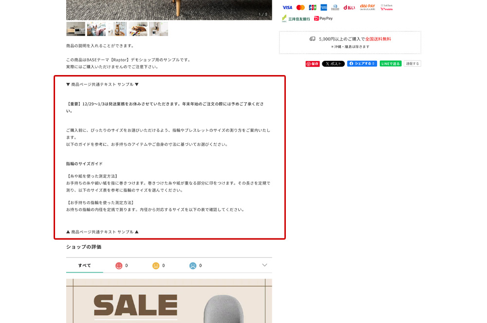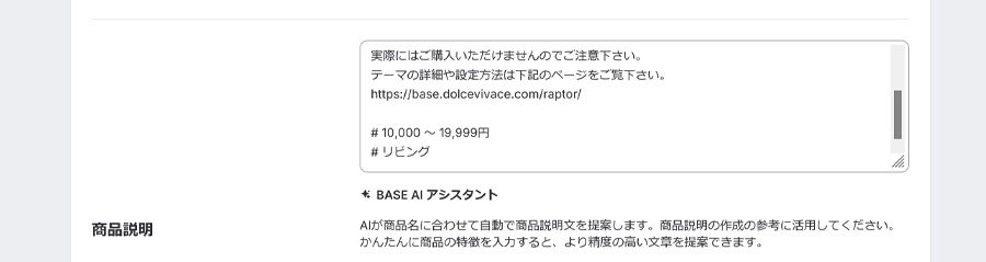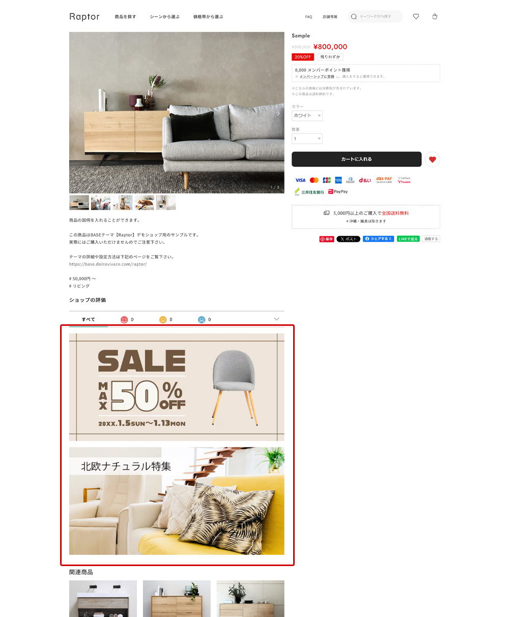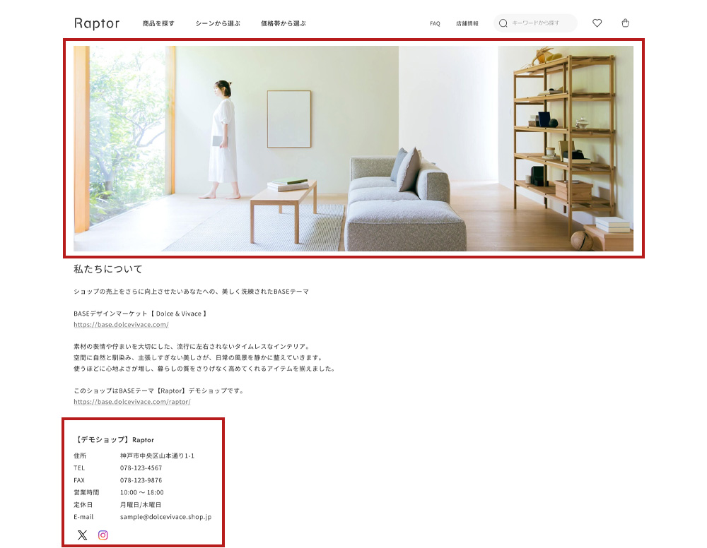 同様に、デモショップのもうひとつのフリースペースのURLはhttps://raptor1.base.ec/about#FAQ