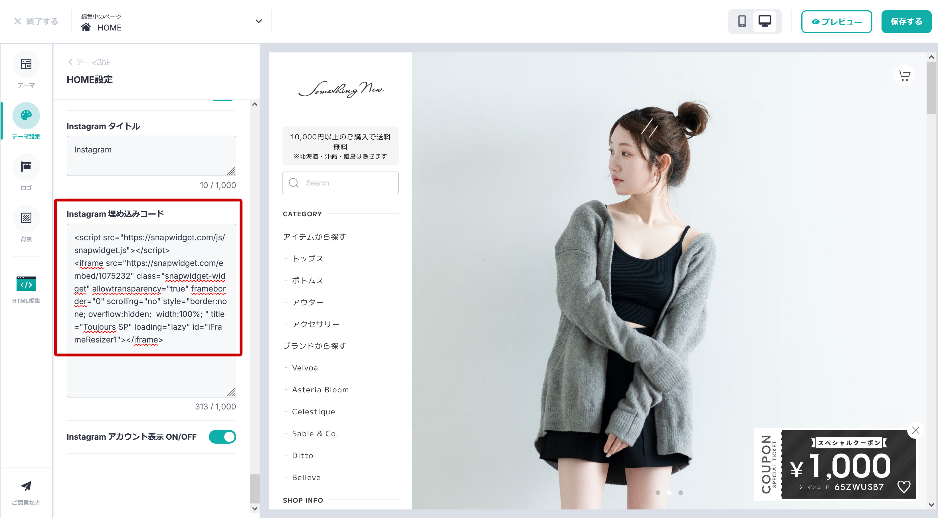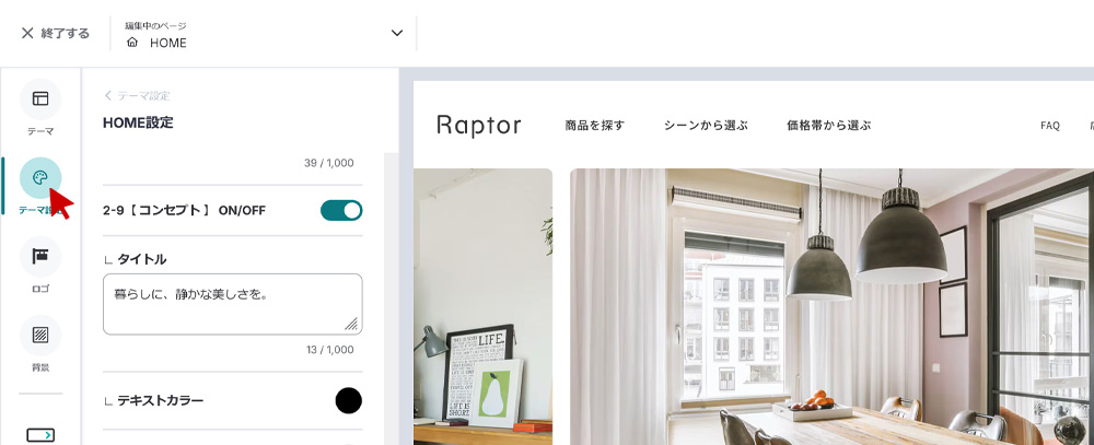 BASE管理画面の「デザイン」の「テーマ設定」で各種機能の設定を行うことができます。