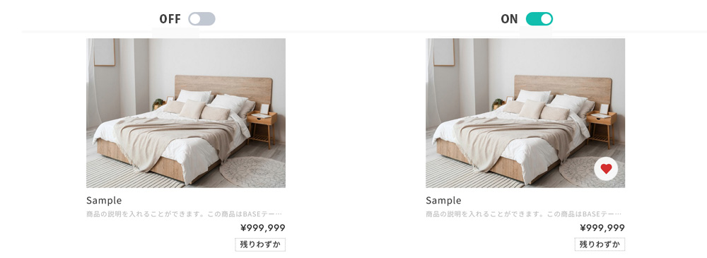 OFFにすると、商品ページだけにお気に入り登録ボタンが表示されます。