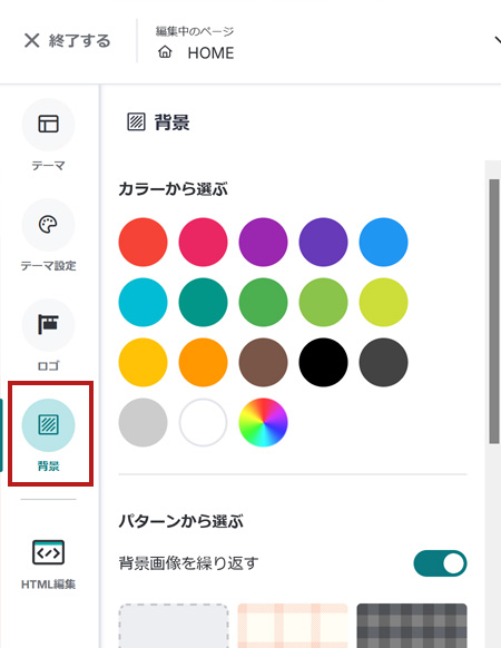 デザイン画面の「背景」でショップ全体の背景色を設定することができます。
