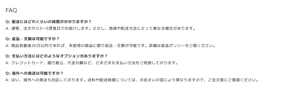 具体例として、デモショップではアバウトページに「 FAQ 」を掲載しています。
